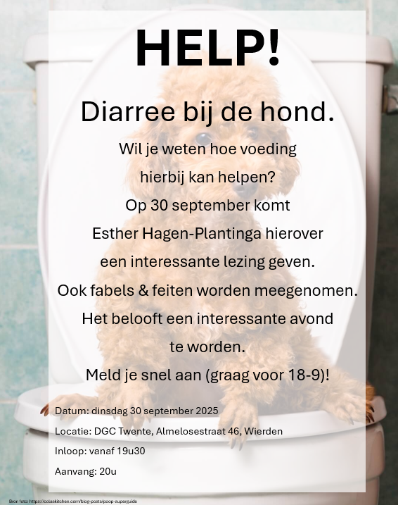 - Dinsdag 30 september 19.30 uur Lezing Help diarree bij de hond